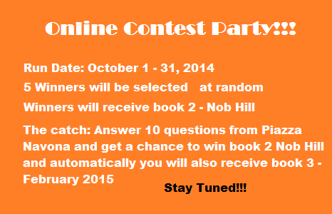 October 23, 2014October 23, 2014 Book Giveaway Contest By Author MLKilian Book Contest Giveaways, 1 Comment Published by mlkilian View all posts by mlkilian book contest giveaway, Book Contest giveaway from MLKilian, Contest to win two books in one, Read Piazza Navona and win Nob Hill Share this: Click to share on Facebook (Opens in new window) Facebook Click to share on X (Opens in new window) X Click to share on Pinterest (Opens in new window) Pinterest Click to share on LinkedIn (Opens in new window) LinkedIn Click to email a link to a friend (Opens in new window) Email Click to share on Tumblr (Opens in new window) Tumblr Go backYour message has been sent Name(required) Warning Email(required) Warning Question 1 - Where does Elise stop before going to Rome? Paris London New York Florence Warning Question 2 - How long have Elise and Mark been married? 5 years 32 years 18 years 25 years Warning Question 3 - What is Elise's younger daughter's name? Claudette Lauren Audrey Grace Warning Question 4 - The name of hotel in Rome where she stays? Hyatt Regency Hotel Regina Baglioni Boscolo Exedra Hotel Raphael Warning Question 5 - Who is attracted to Elise in Rome? Mr. Caputo Jon Carlo Filipo Alberto Warning Question 6 - Who is Carla? A shop keeper in Rome A lady in the church Elise's best friend Audrey's friend in Florence Warning Question 7 - Who does Elise run into in the elevator her husband Mark Tony her son-in-law A British actor - Mr. Celebrity Alberto her secret admirer Warning Question 8 - Elise has a chauffeaured weekend getaway from Rome to? Venice Verona Como Paris Warning Question 10 - Does Elise move to Rome in Piazza Navona? Yes No Warning Warning. Submit Δ Like Loading... Related