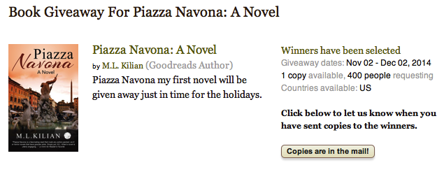 Another exciting end to a contest I posted through Goodreads, offering copies of my first novel – Piazza Navona, to those in the US entering the contest. Thank you for adding my novel to your to-read list. I hope you find the story entertaining, and heartwarming.