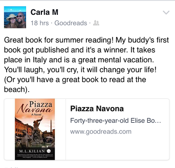 I got a funny text from Carla – telling me the story of how she finally got around to reading Piazza Navona. She said when the book first came out, she ordered it right away to read on her cell phone, but had trouble seeing. Then she ordered a paperback version and moved across the globe before the book was delivered, possibly getting lost in the mail. My hope that someone awesome got to read it.