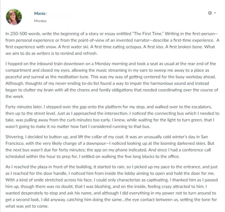 The first encounter with an intriguing stranger is exciting, and you do a really nice job of narrating that internal tug-of-war of wanting to take a second look, but trying not to – we have all been there! The instantaneous “crazy” attraction rang true, too, and I found myself wanting more, which you provide a great set up for in “..for what was yet to come.” And, as a long time public transit commuter to the City, I could easily identify with the desire to gain some calm before the start of the hectic day by putting on headphones, etc. The missed bus connection and the long, cold walk to the office to make it in time to prep for the call also hit home – I can sense the frustration and pressure. It makes the last paragraph a welcome surprise. Her day is looking up! I really enjoyed reading your piece. Barbara